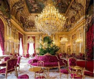 طراحی داخلی سالن قصر با رنگ قرمز ست طلائی